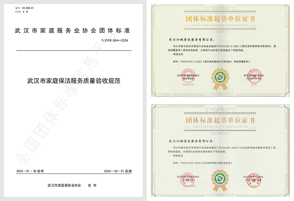 主導起草3項行業(yè)標準:《高空清洗管理規(guī)范》《公共場所防疫技術規(guī)范》《武漢市家庭保潔服務質量驗收規(guī)范》
